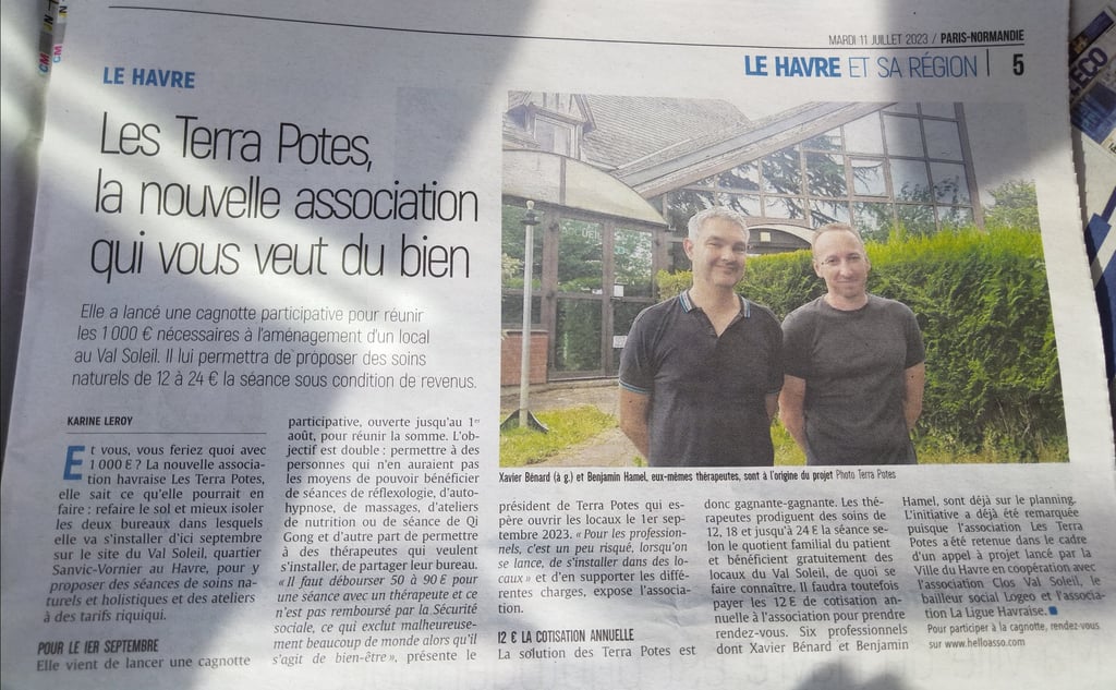 La solution des Terra Potes est donc gagnante-gagnante. Les thérapeutes prodiguent des soins de 12, 18 et jusqu'à 24€ la séance selon le quotient familial du patient et bénéficient gratuitement des locaux du Val Soleil, de quoi se faire connaître. Il faudra toutefois payer les 12€ de cotisation annuelle à l'association pour prendre rendez-vous. Six professionnels dont Xavier Bénard & Benjamin Hamel, sont déjà sur le planning. L'initiative a déjà été remarquée puisque l'association "Les Terra Potes" à été retenue dans le cadre d'un appel à projet lancé par la ville du Havre en coopération avec l'association Clos Val Soleil, le bailleur social Logeo et l'association La Ligue Havraise.